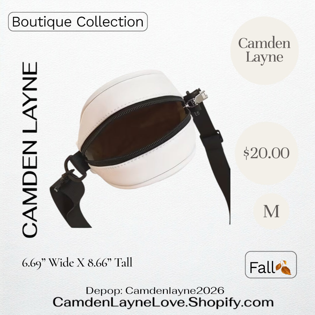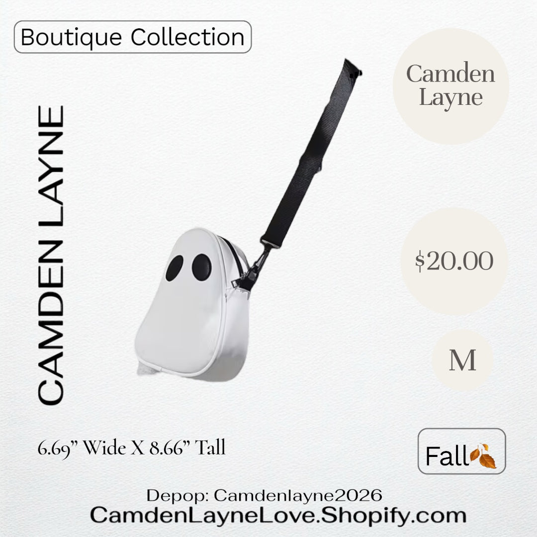 Camden Layne ghost-shaped crossbody bag from their "Boutique Collection," presented against a textured, light gray background.Key Visuals and Information: