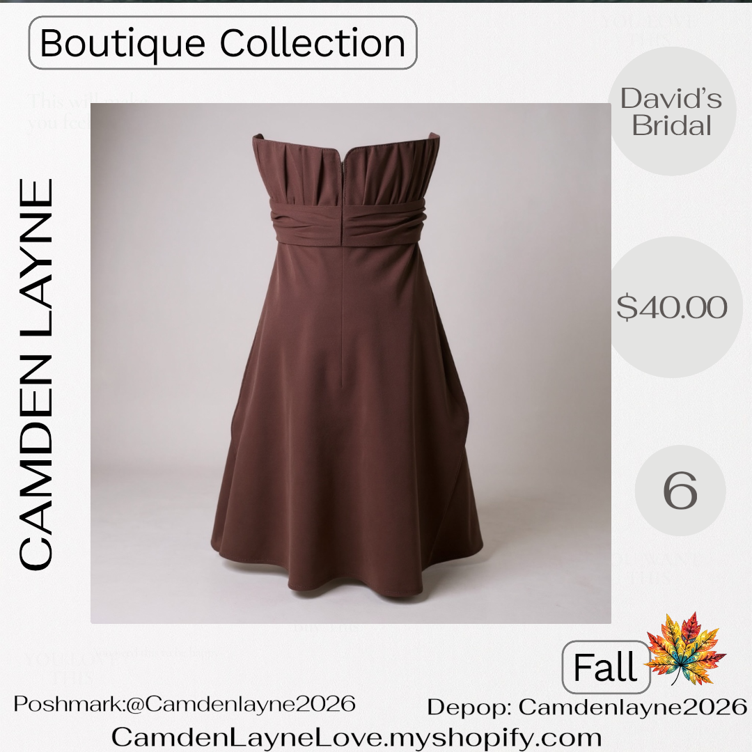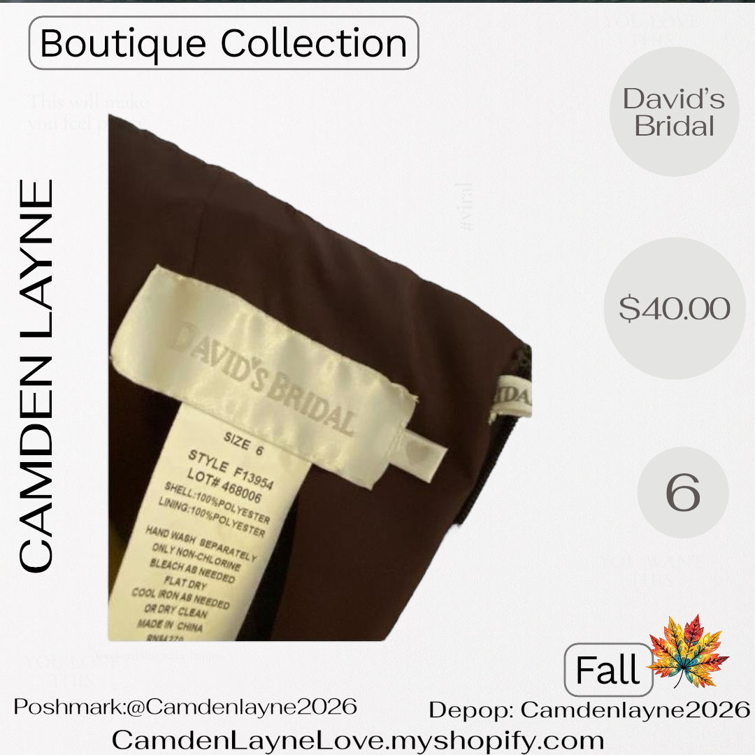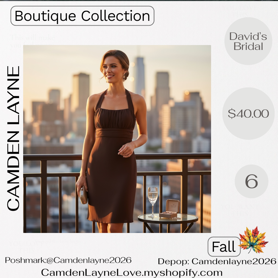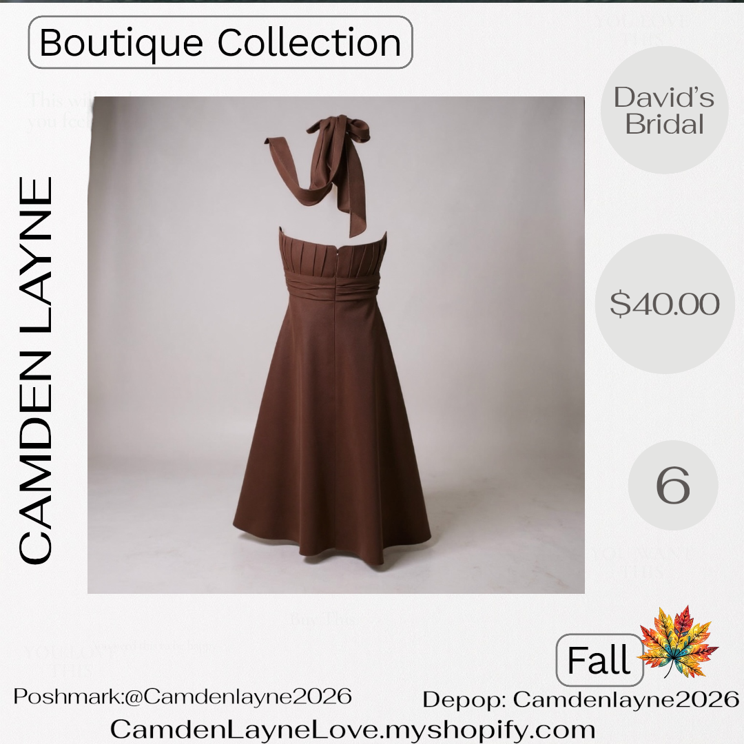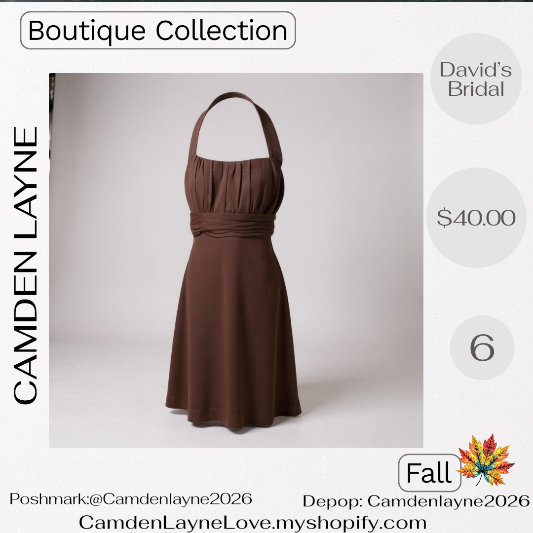 brown, knee-length, A-line halter-neck dress from David's Bridal, offered by Camden Layne .