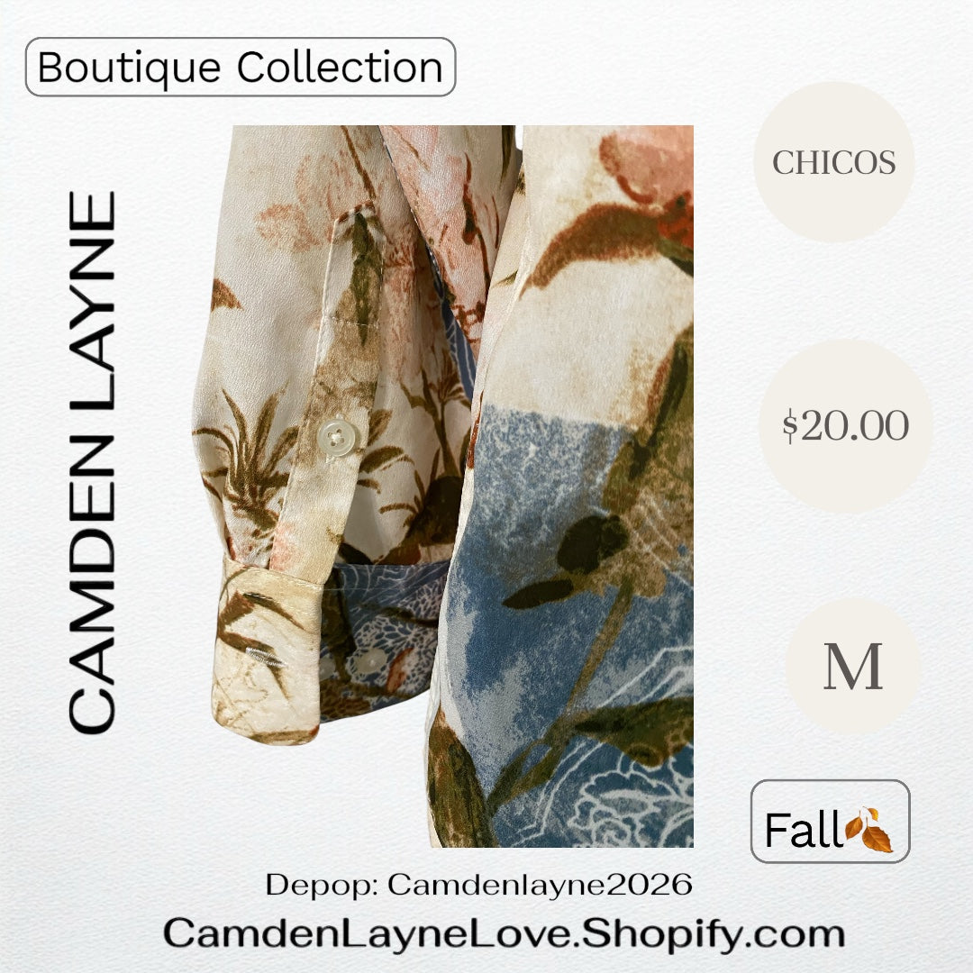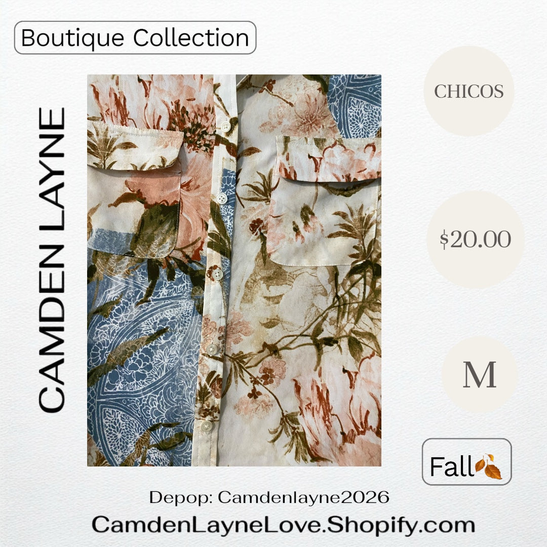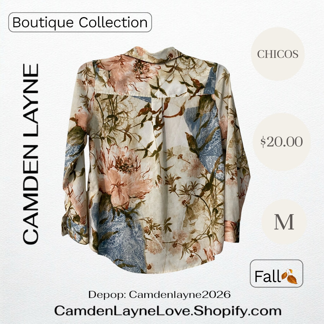 - Pattern & Colors: The blouse features a vibrant and intricate floral pattern with large blossoms in shades of pink, peach, and muted greens, interspersed with elements resembling blue and white paisley or tile patterns. The base color of the fabric appears to be a light cream or off-white.