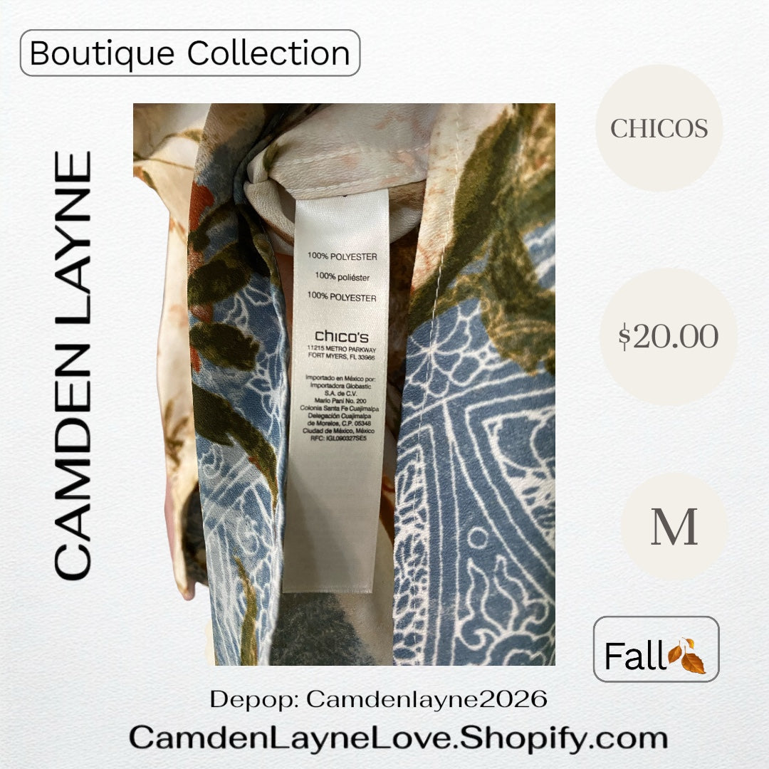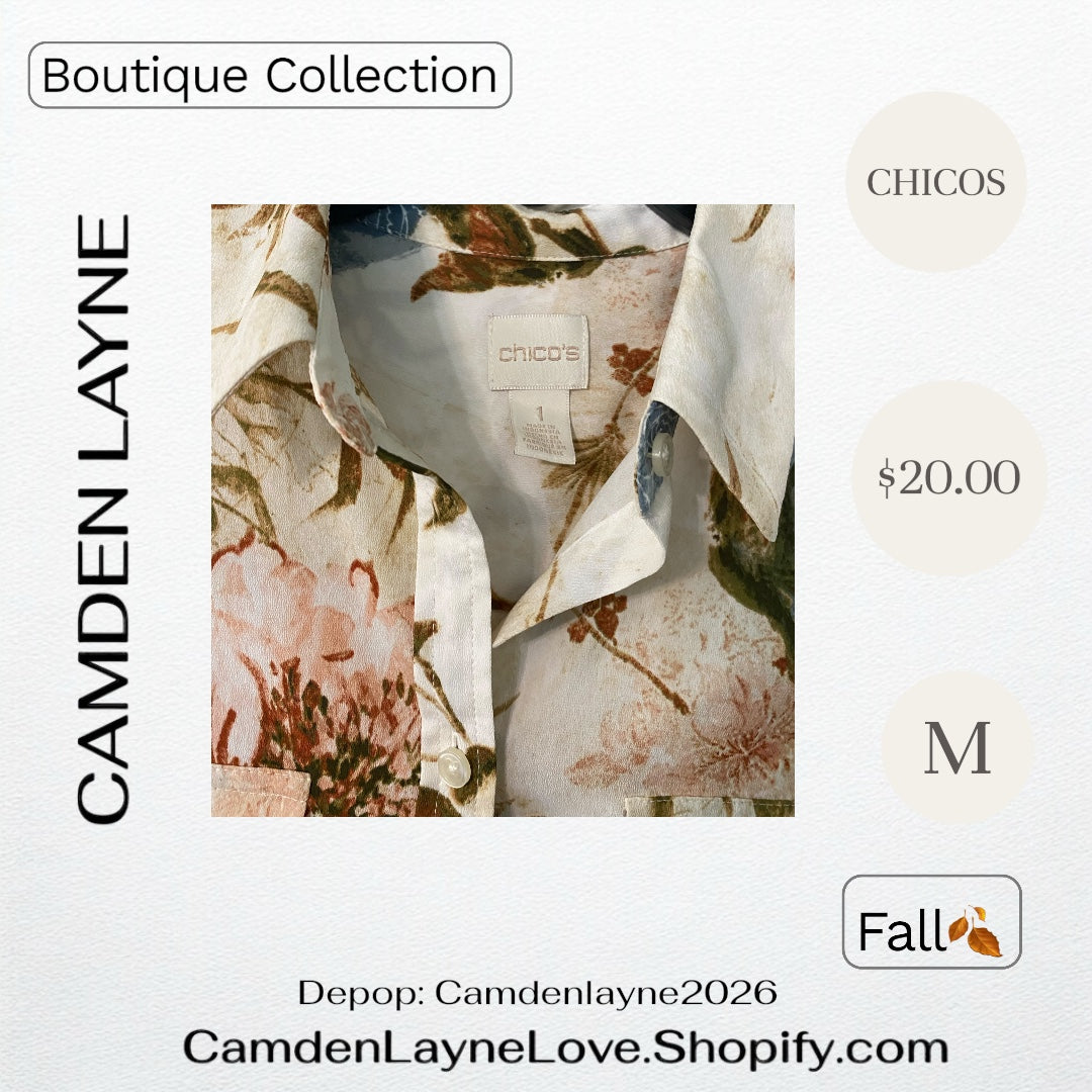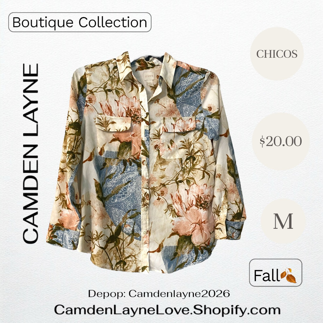 - Pattern & Colors: The blouse features a vibrant and intricate floral pattern with large blossoms in shades of pink, peach, and muted greens, interspersed with elements resembling blue and white paisley or tile patterns. The base color of the fabric appears to be a light cream or off-white.