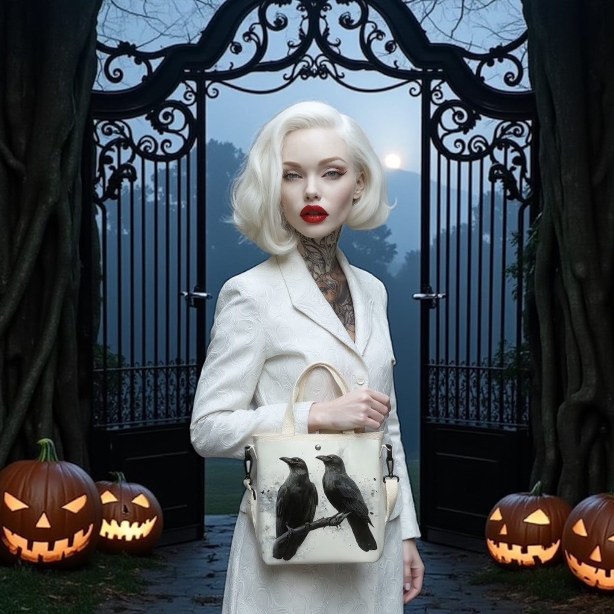- Raven Graphic: The front of the bag is adorned with a prominent and artistic illustration of two black ravens perched on a branch, rendered in a detailed, perhaps painterly, black and white style, creating a visually compelling focal point.