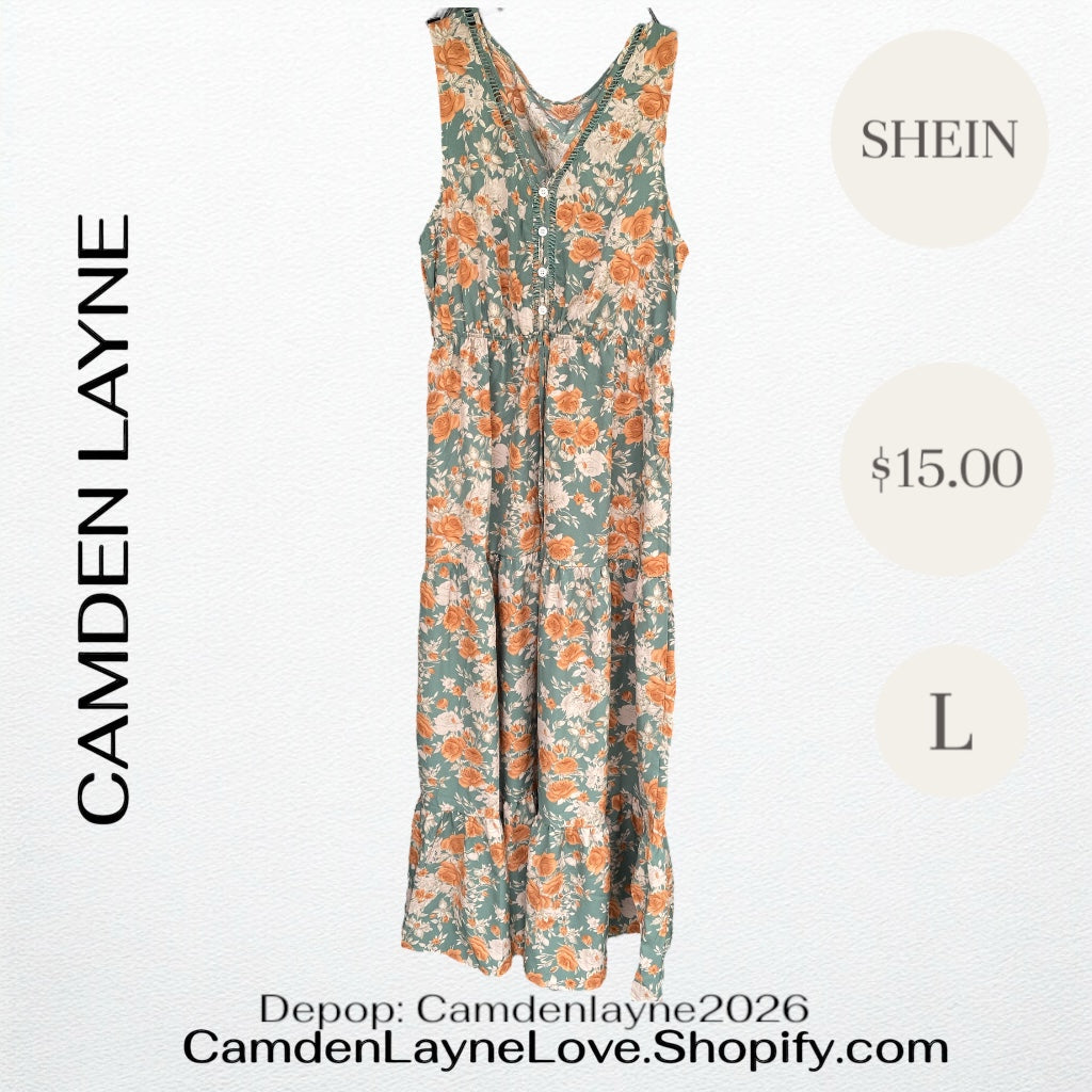 charming midi-length dress with a distinctive green base adorned with vibrant orange and yellow floral patterns.Key features of the dress include: