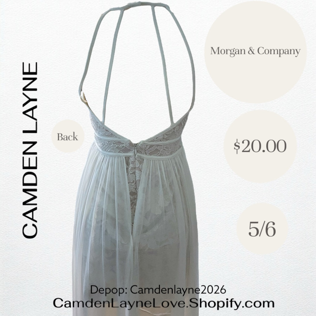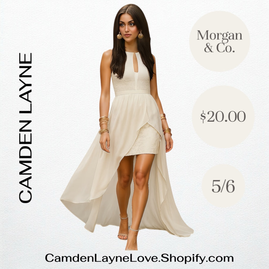 The dress in the image appears to be a white, lace, high-low halter dress with a keyhole cutout at the neckline. This style is often found in formal or semi-formal wear, suitable for occasions like prom, homecoming, or as a wedding guest dress.