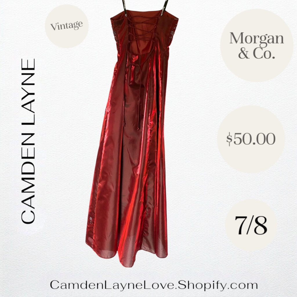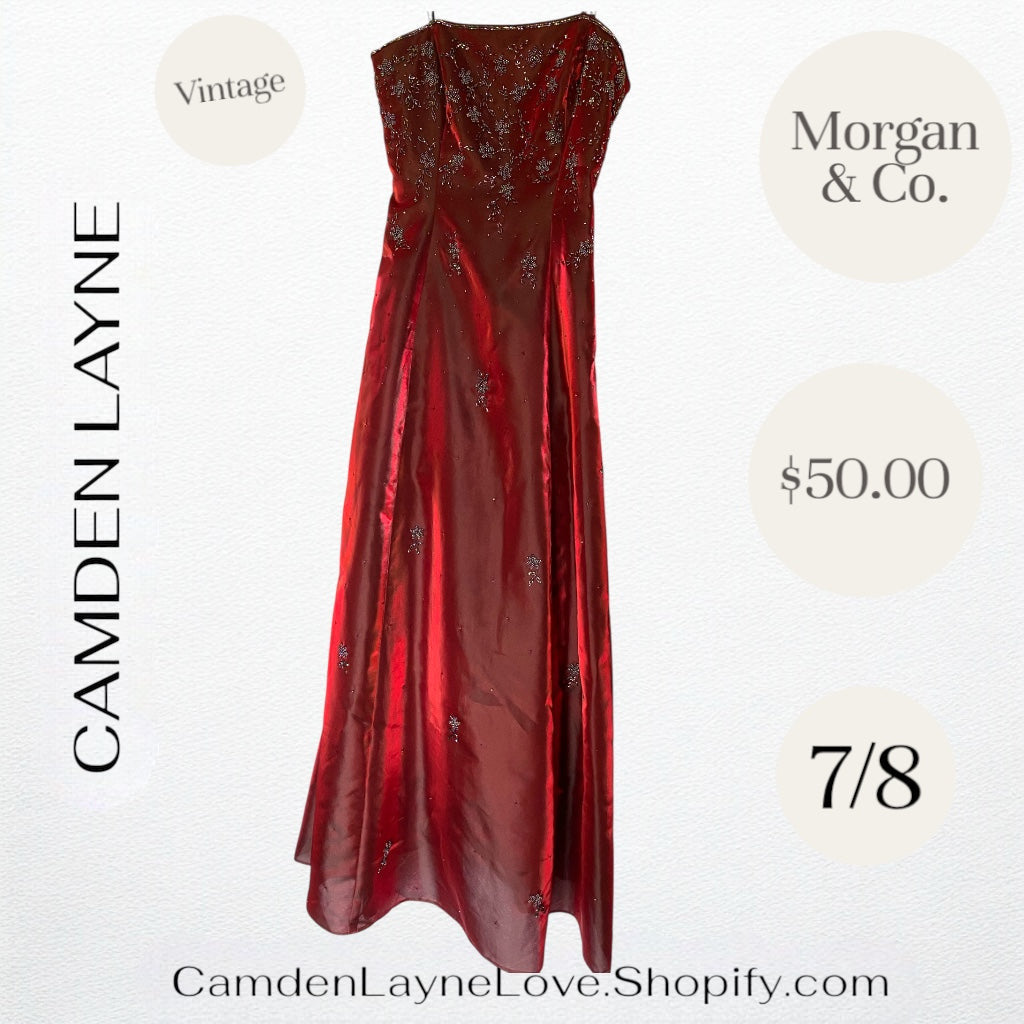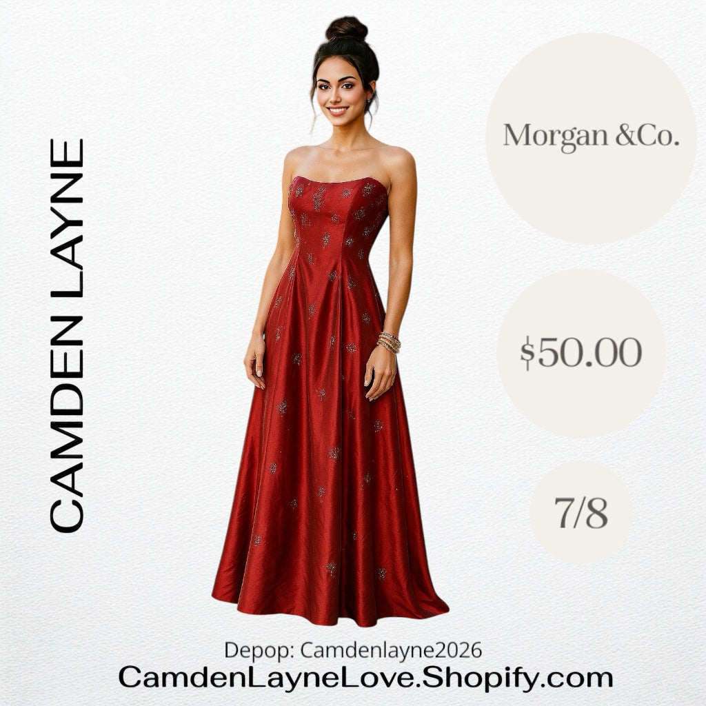 The dress is a red, strapless formal gown by the brand Morgan & Co..