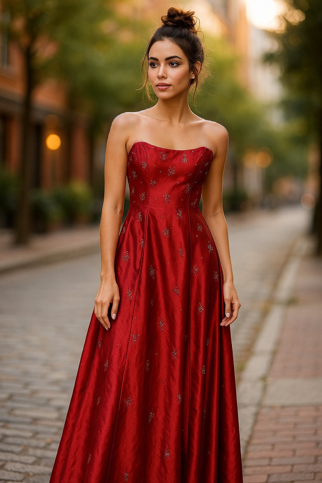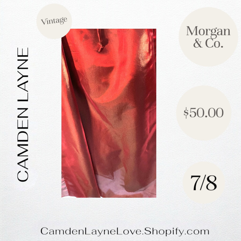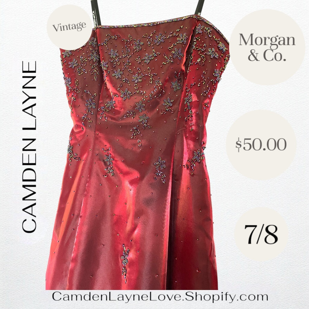 The dress is a red, strapless formal gown by the brand Morgan & Co..