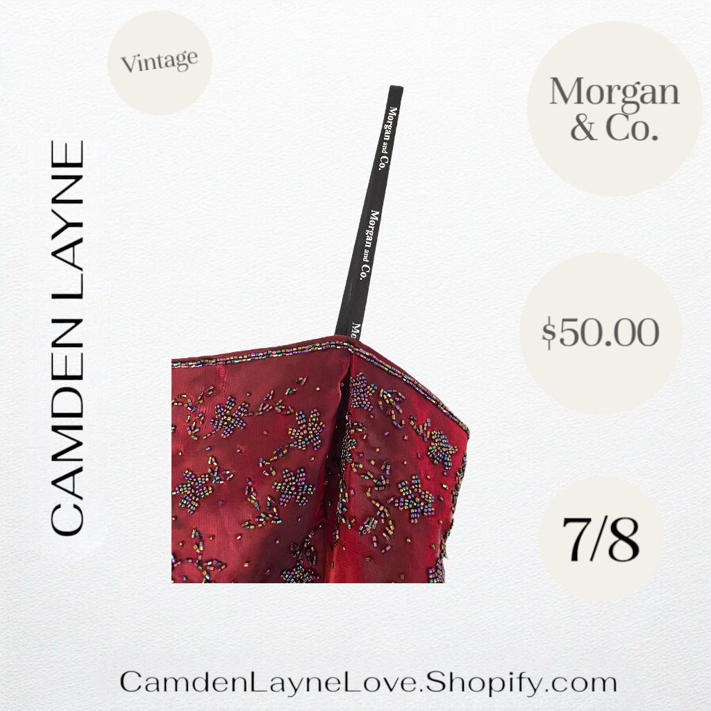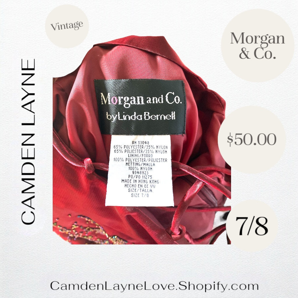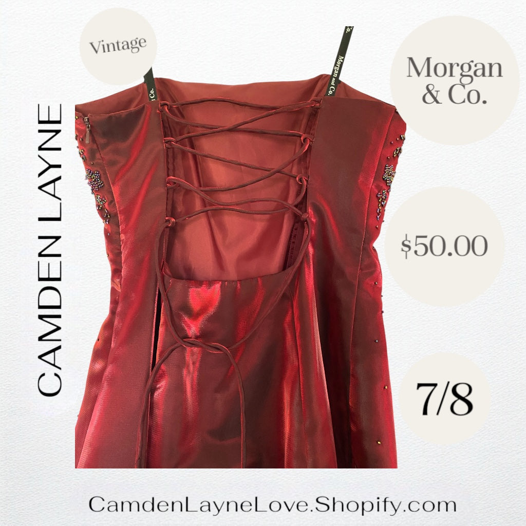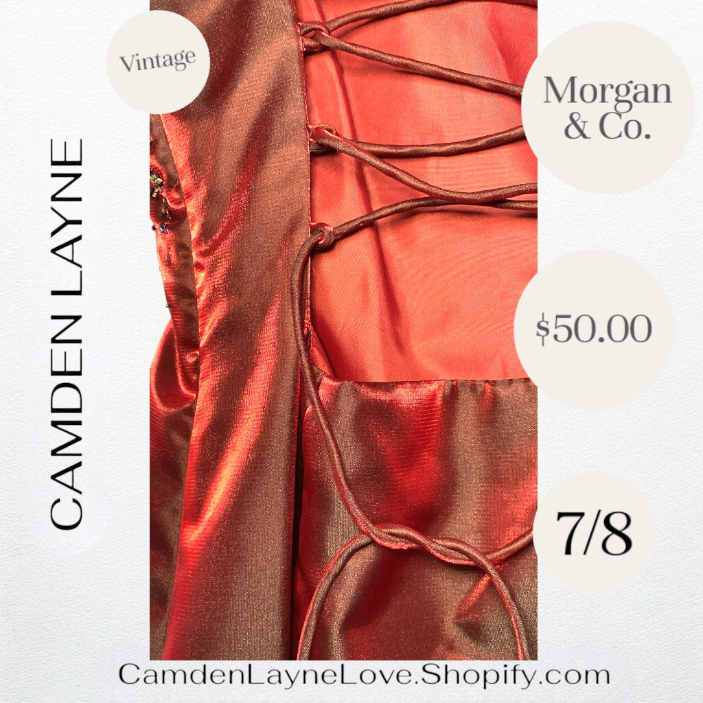 - Details: Some similar Morgan & Co. dresses feature details like adjustable straps, structured horsehair hems, side zippers, and open back with ties for cinching, which might also be present in this design.