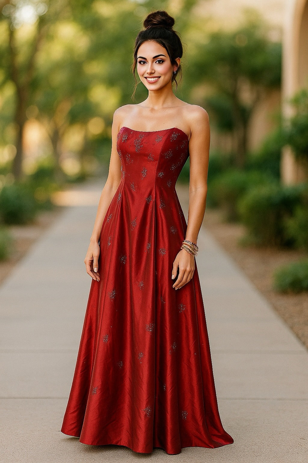 - Style: It's a classic strapless design, indicating a formal or semi-formal occasion dress, likely for events like prom or an evening party.