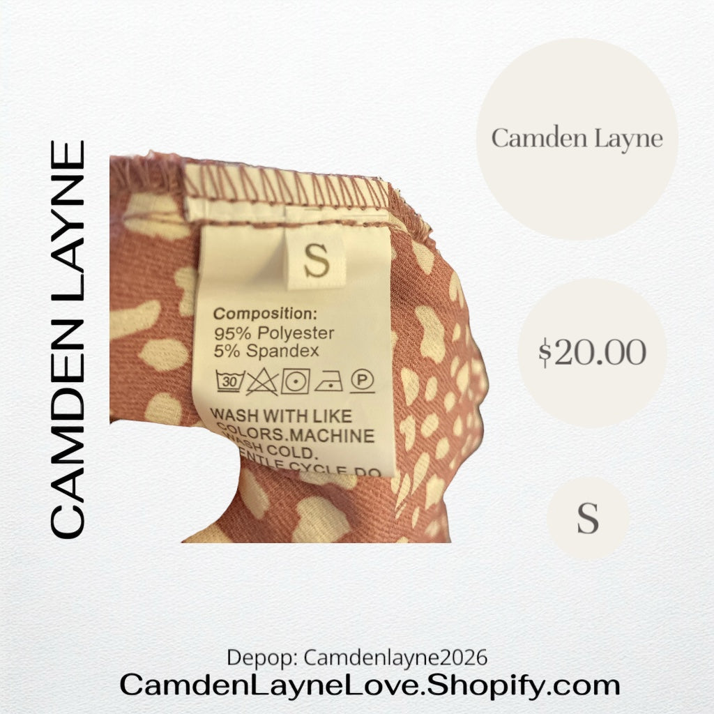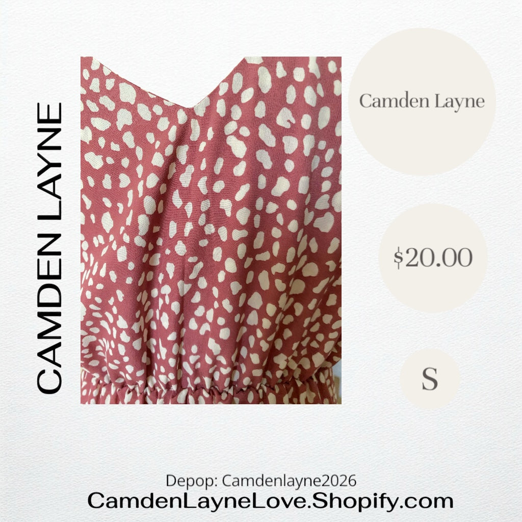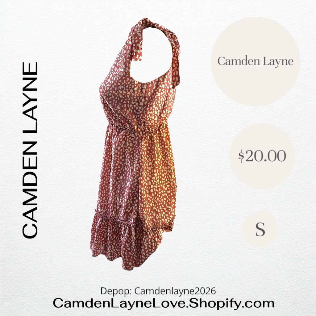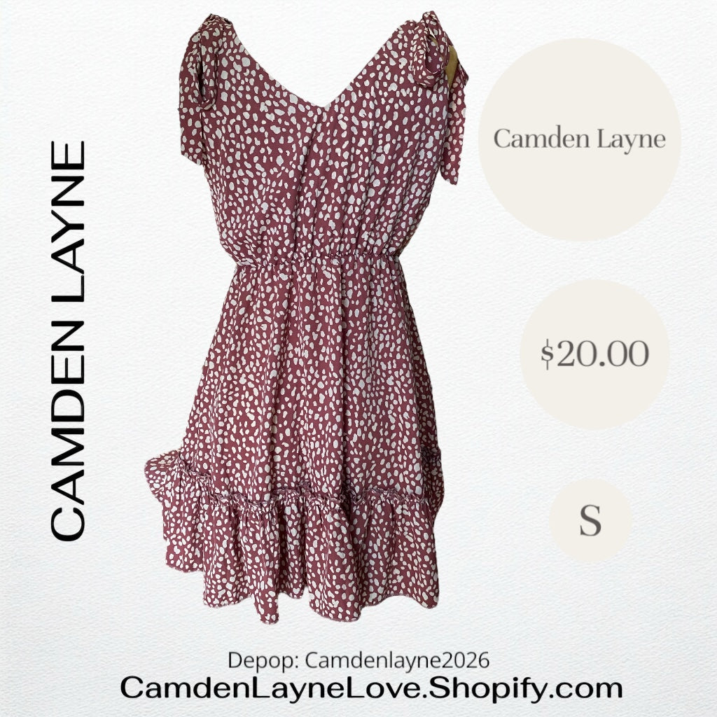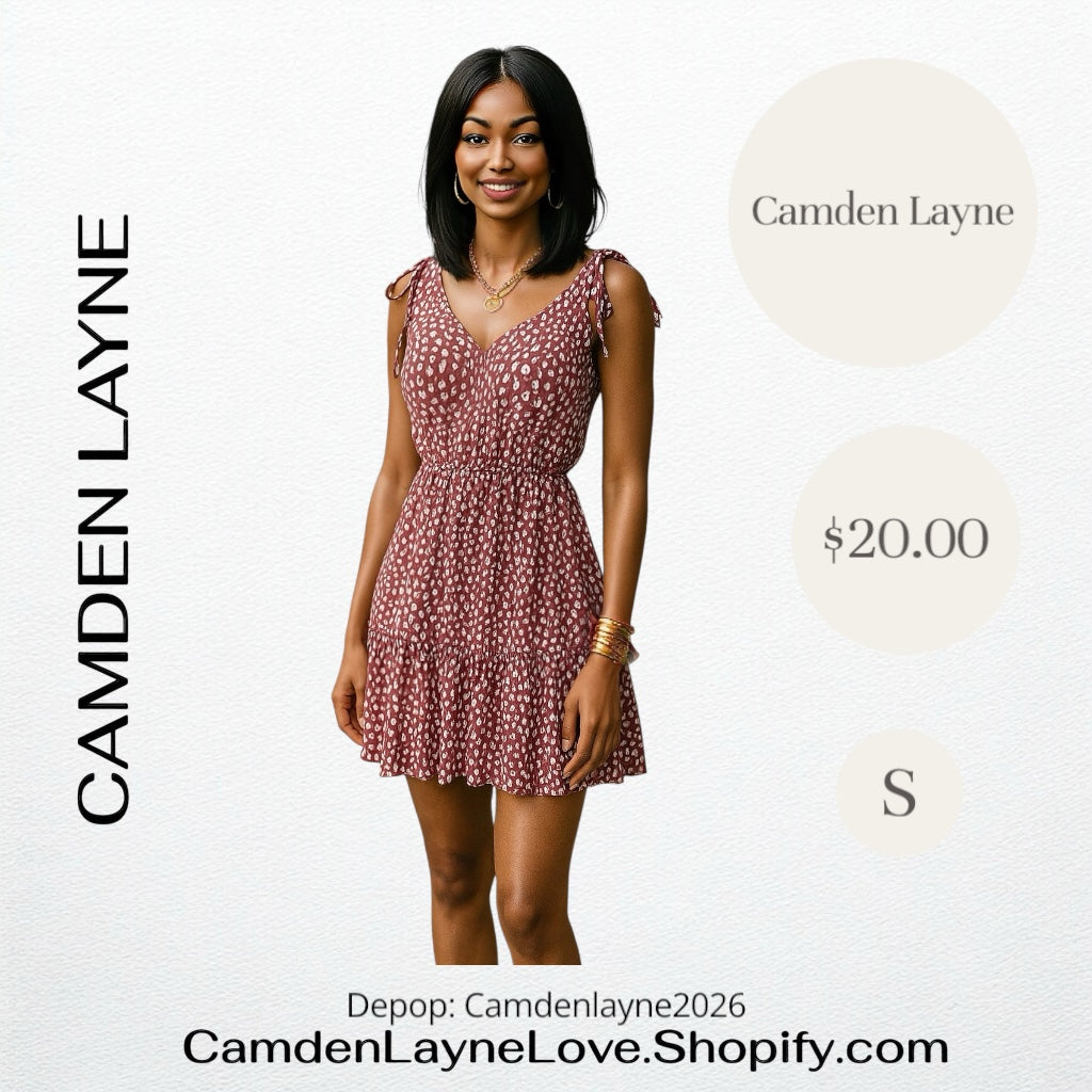 sleeveless, V-neck mini dress in a reddish-brown hue with a light speckled or patterned print [Image]. It features tie details on the shoulders and a ruffle or tiered hemline, creating a flowy, relaxed silhouette. The waist appears cinched, likely with elastic or a similar feature, emphasizing the flared skirt