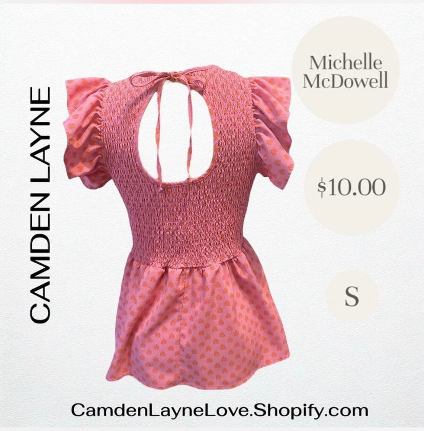 Michelle McDowell pink, fully sleeved, print shirt.