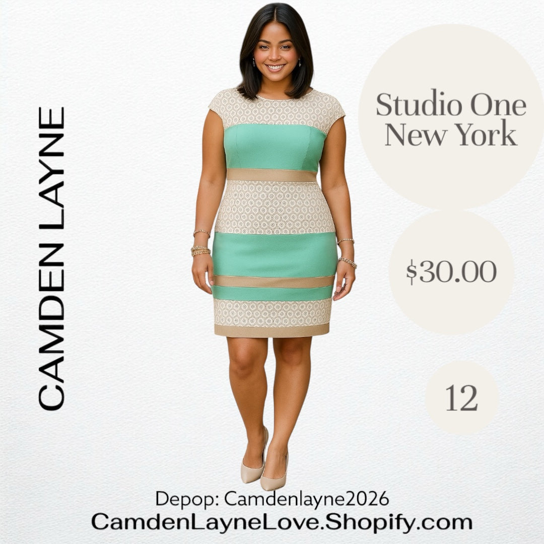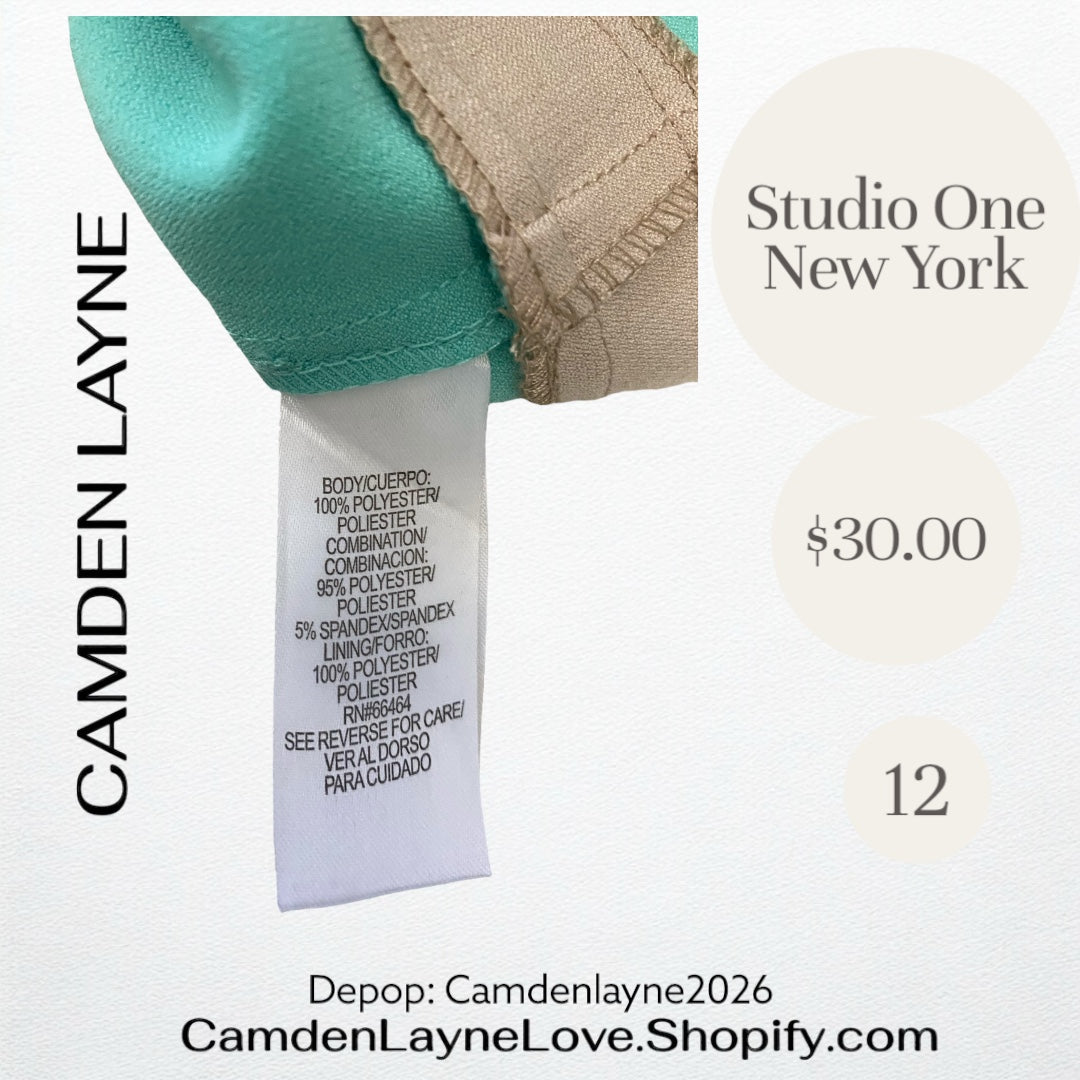 - Design Details: The dress incorporates horizontal bands of color, with the patterned beige/ivory sections interspaced with solid mint green bands. While not explicitly stated for this exact dress, similar Studio One New York dresses often feature a zip closure at the back and are lined.