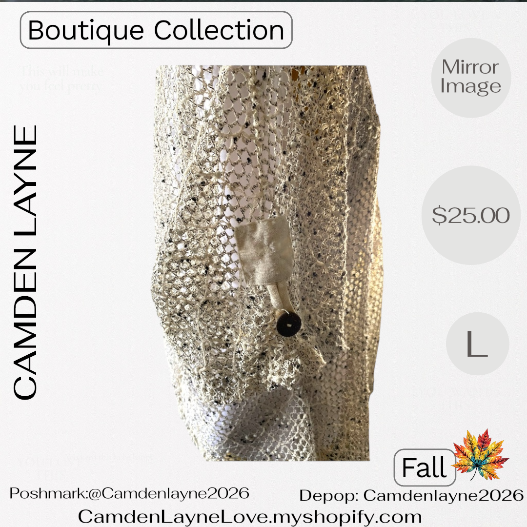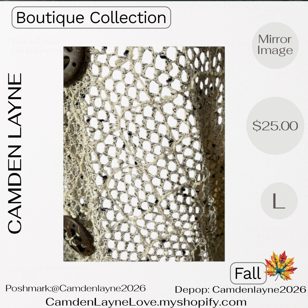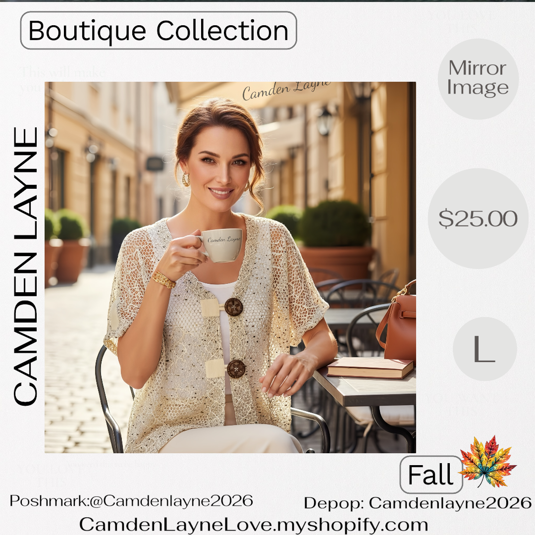 - Outer Layer (Sweater/Cardigan): This piece is an open-weave, light-colored (appears to be a muted gold or champagne hue) short-sleeved top with a relaxed fit. It features a V-neckline and a unique front closure with two prominent, round, decorative buttons, possibly made of wood or a similar natural material, secured with loop closures. The open-weave knit suggests a breathable and textured feel, ideal for layering or warmer weather.