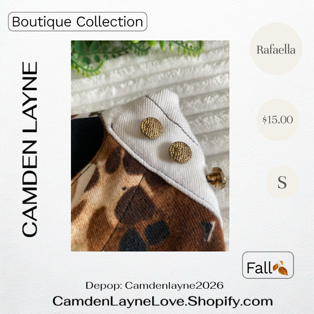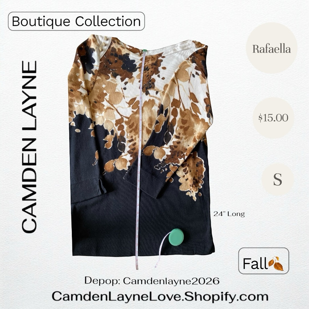 - Color Scheme: The top primarily features a combination of black, white, and various shades of brown and tan. The bottom portion of the top, including the sleeves, is solid black.