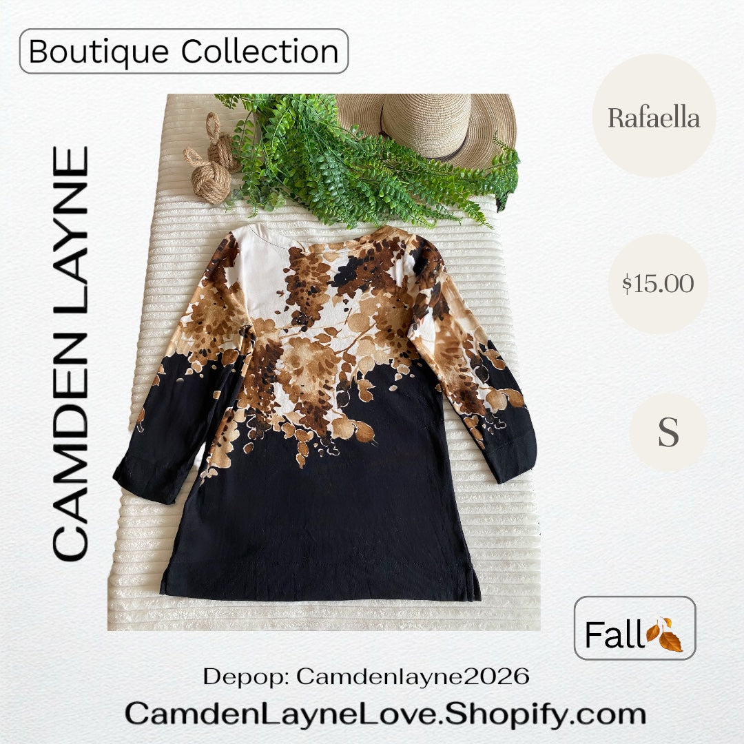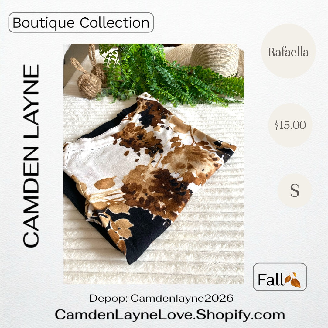 - Pattern: The upper portion of the top showcases an intricate floral or botanical pattern in shades of brown and tan against a white or off-white background. This pattern extends from the neckline down to meet the solid black section.