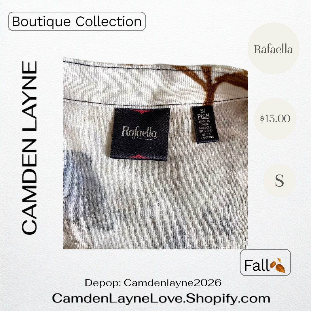 This Rafaella top features a unique design with a distinct color block and floral pattern.