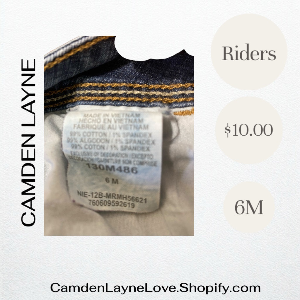 The jeans are a classic blue denim with a medium wash, showing some natural fading or whiskering, particularly around the upper thighs and knees, suggesting a worn-in look. They feature the traditional five-pocket styling, including two front pockets (with a smaller coin pocket inside one), and two rear pockets. The closure appears to be a standard button and zipper fly. The cut is bootcut, meaning the leg widens slightly from the knee down, designed to accommodate boots. The fabric shows a slight texture characteristic of denim. The jeans are presented neatly folded or laid flat, showcasing the full length and a general sense of their fit.