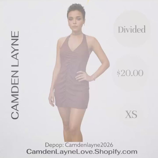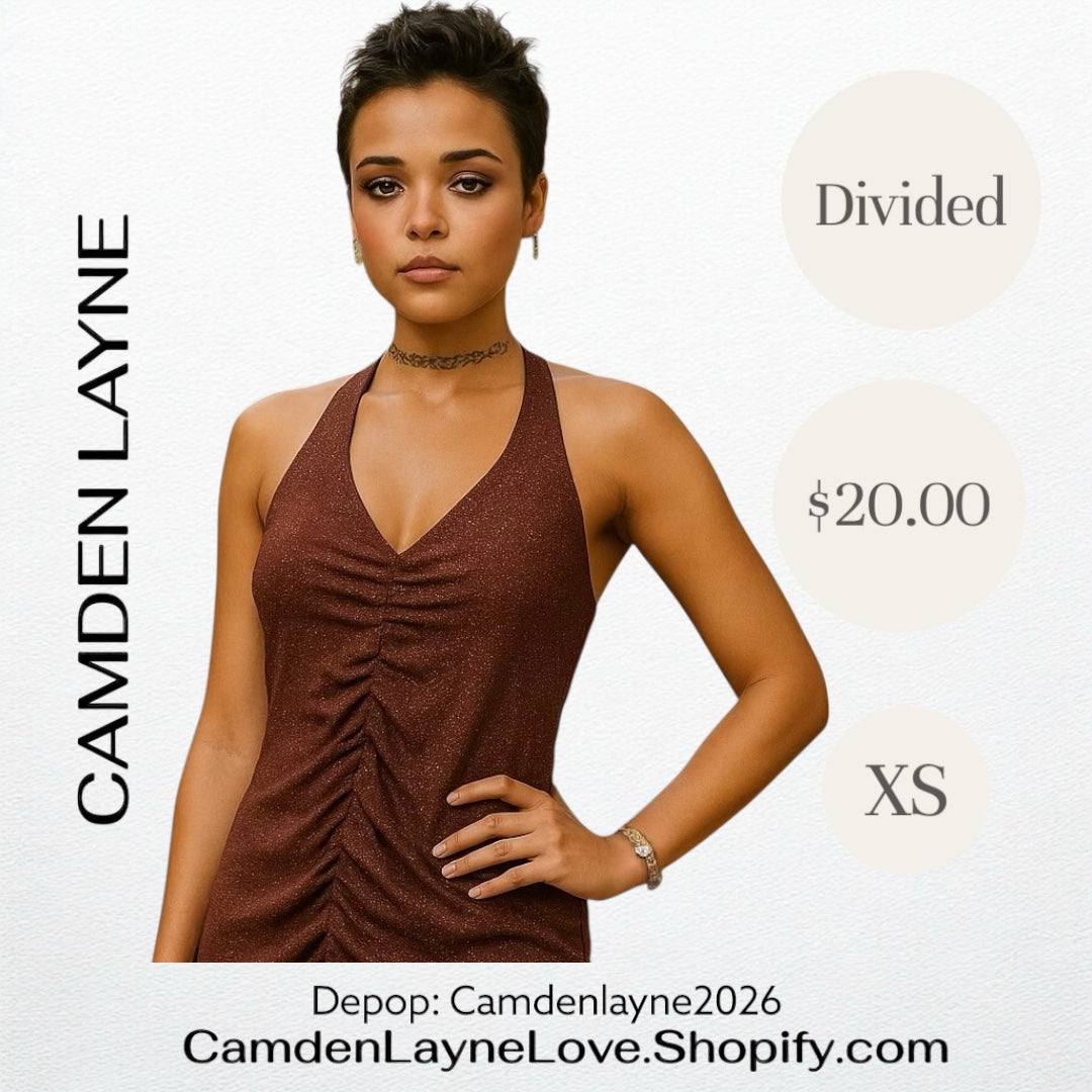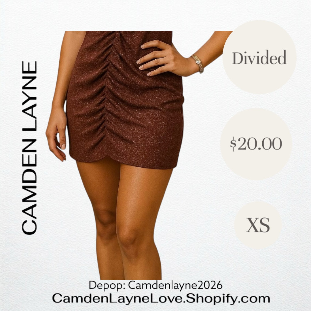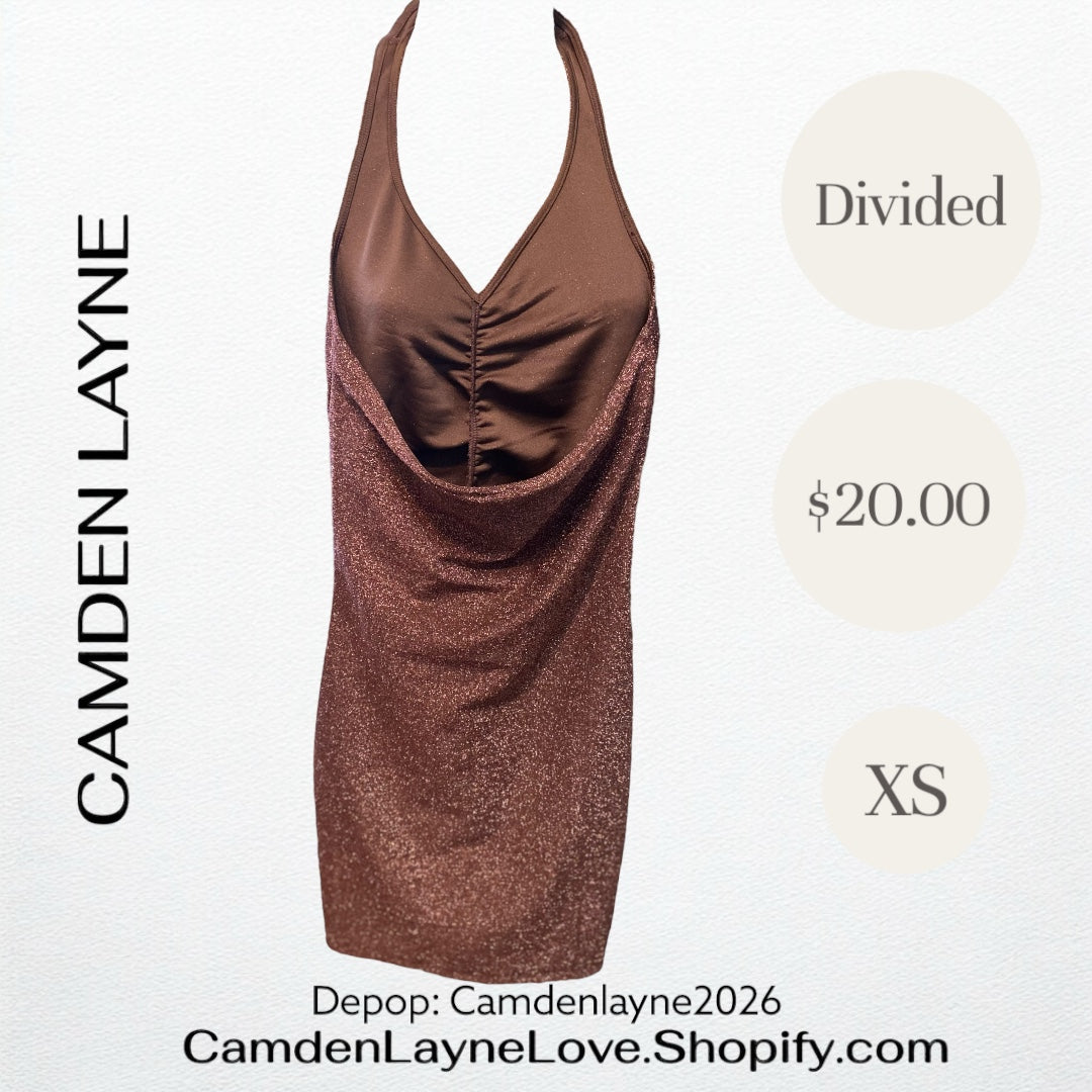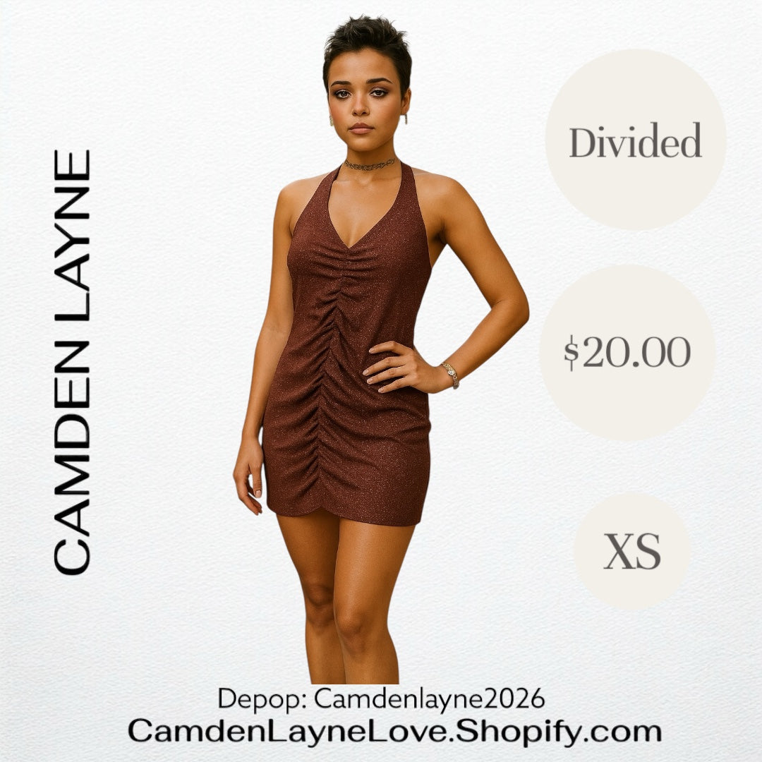 This is a"Divided" mini dress in a shimmering brown color, size XS. It features a halter neckline and significant ruching detail throughout the bodice and skirt, creating a figure-flattering, bodycon silhouette. The dress is made of a metallic or glittery fabric, adding to its visual appeal.