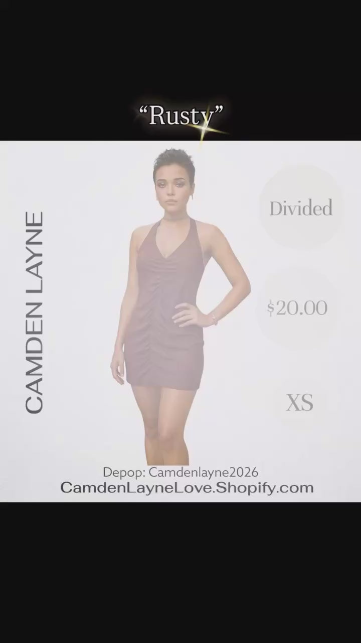 This is a"Divided" mini dress in a shimmering brown color, size XS. It features a halter neckline and significant ruching detail throughout the bodice and skirt, creating a figure-flattering, bodycon silhouette. The dress is made of a metallic or glittery fabric, adding to its visual appeal.