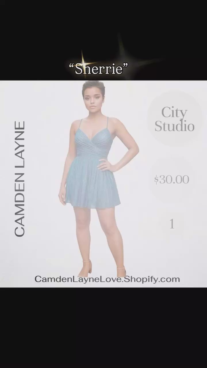 Teal, shimmery fit & flare mini dress from City Studio, featuring a crisscross V-neckline and spaghetti straps.