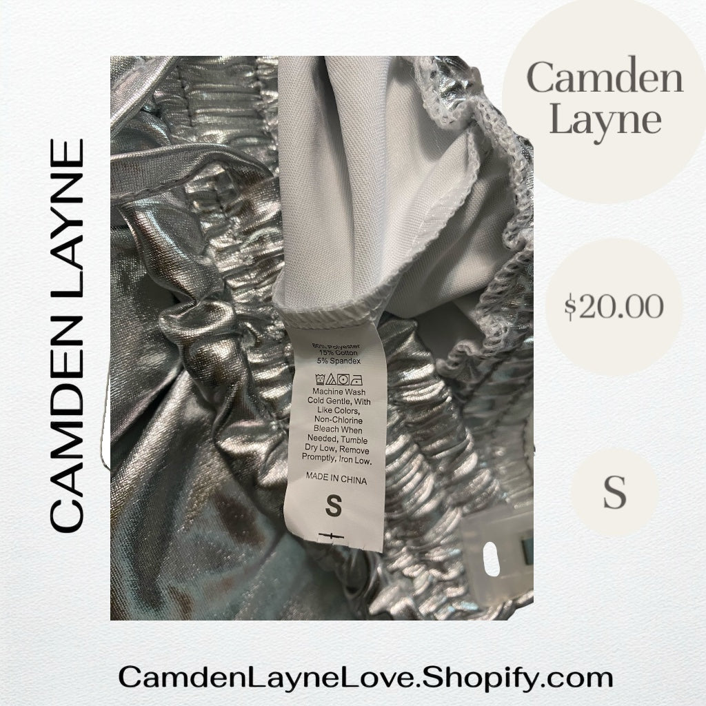 silver metallic shorts featuring a shiny, reflective finish that gives them a distinctive and eye-catching appearance.Here's a more detailed description: