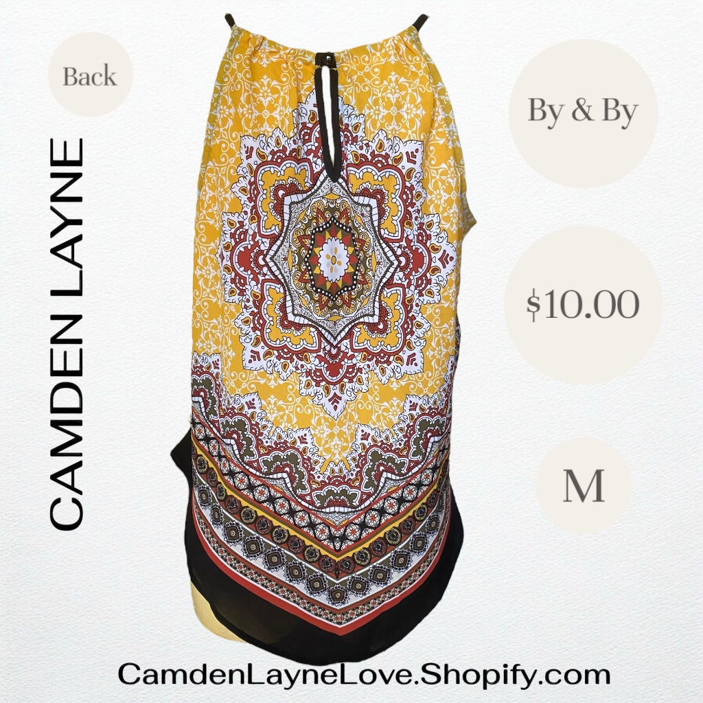 - Color and Print: The top features a prominent, intricate mandala print primarily in shades of yellow, gold, red, and black, against a generally light background. The mandala design is centrally located and spreads outwards, incorporating various geometric and floral-inspired patterns.