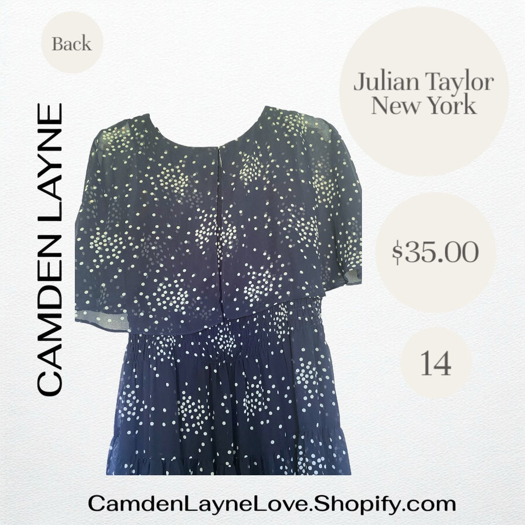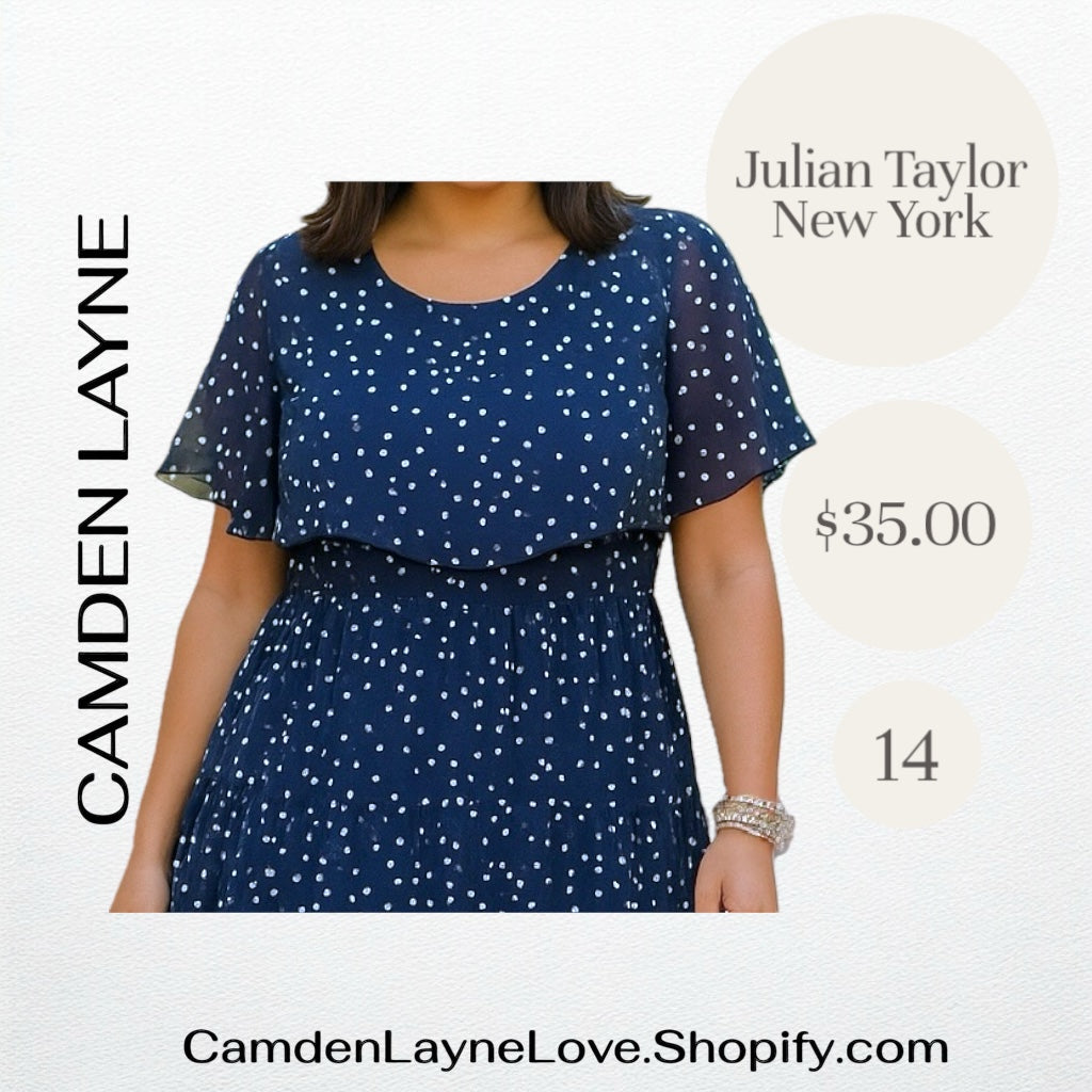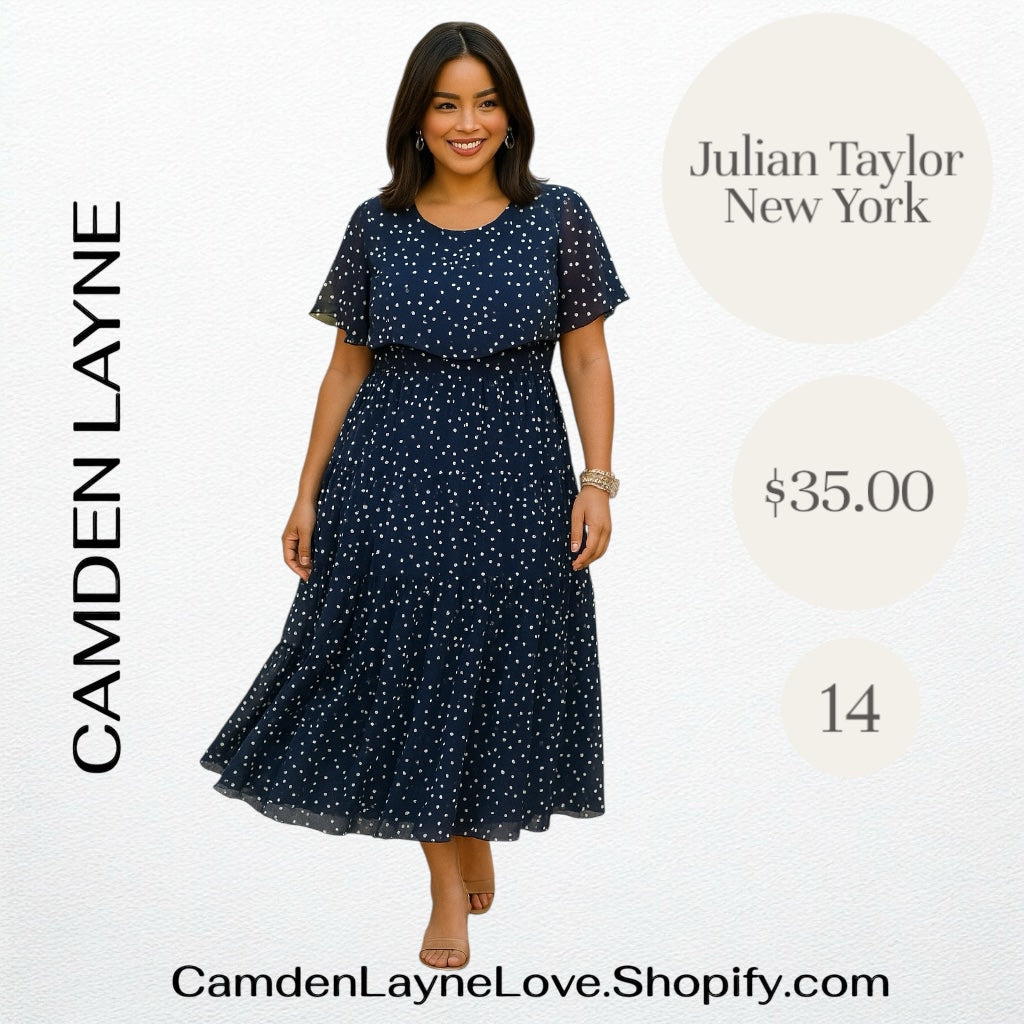The Julian Taylor New York dress featured by Camden Layne is a navy blue midi dress adorned with white polka dots.