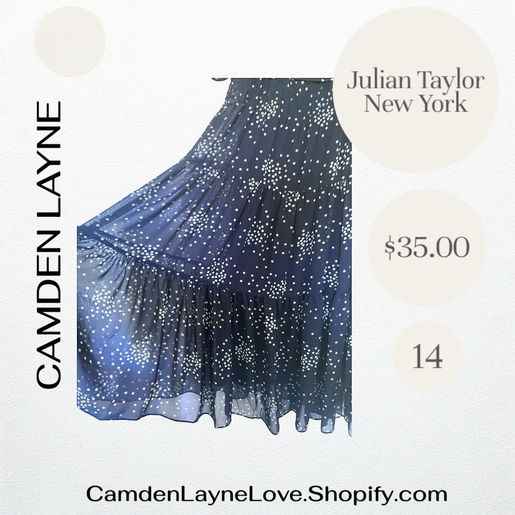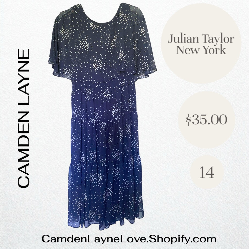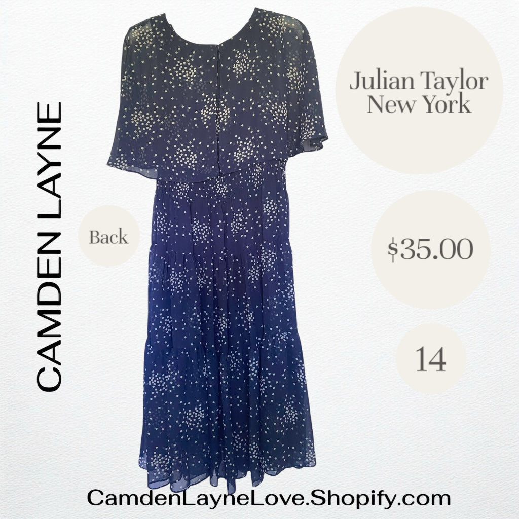 The Julian Taylor New York dress featured by Camden Layne is a navy blue midi dress adorned with white polka dots.