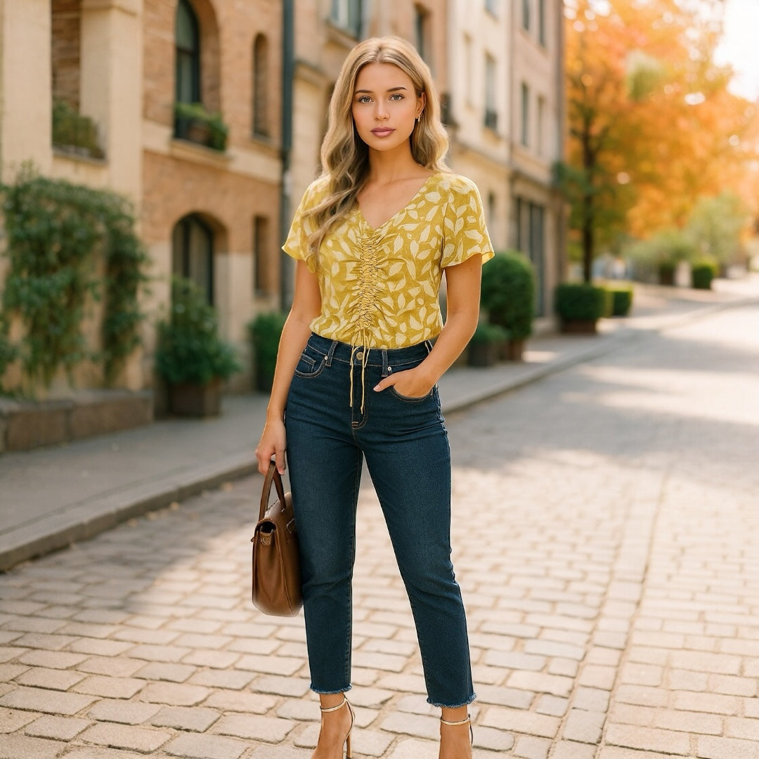 - The top has a V-neckline with a unique ruched or gathered detail down the center front, possibly with an adjustable drawstring or tie at the hem, adding a touch of feminine charm and allowing for a customizable fit.